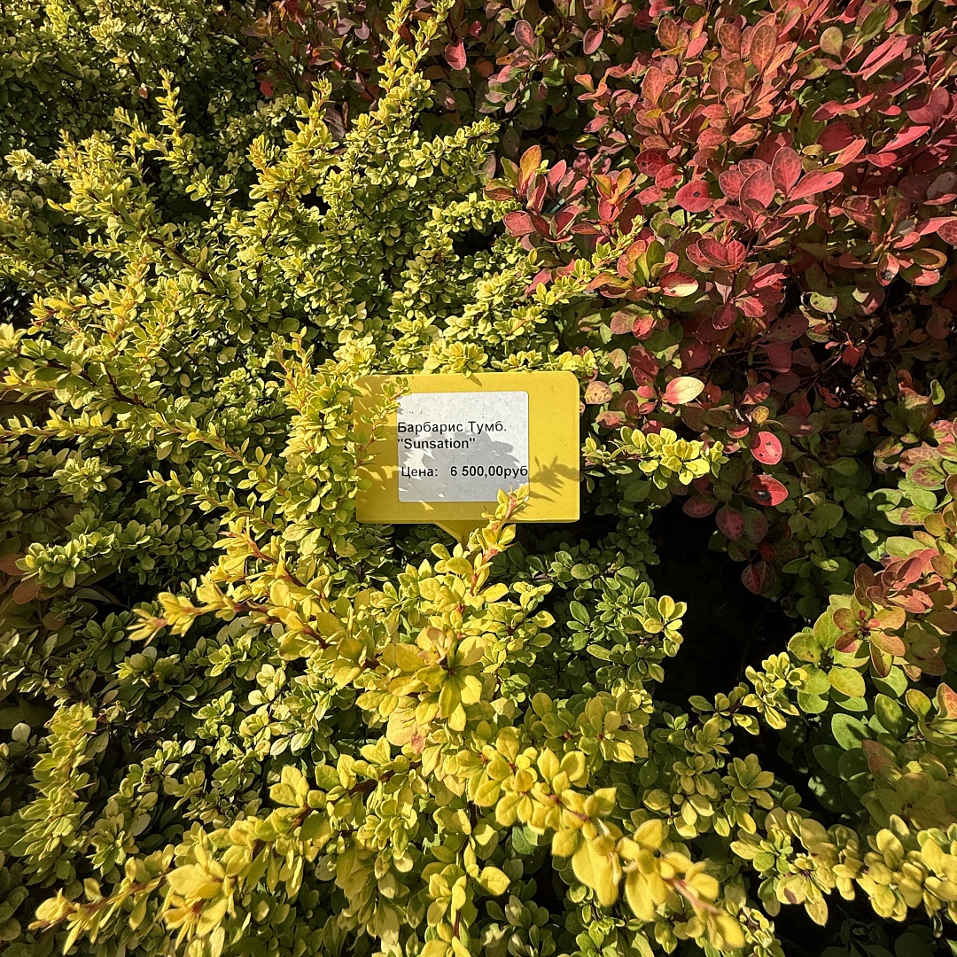 - Sunsation — барбарис с золотистой листвой, которая не выгорает на солнце и отлично подчёркивает тёмные растения в композициях.