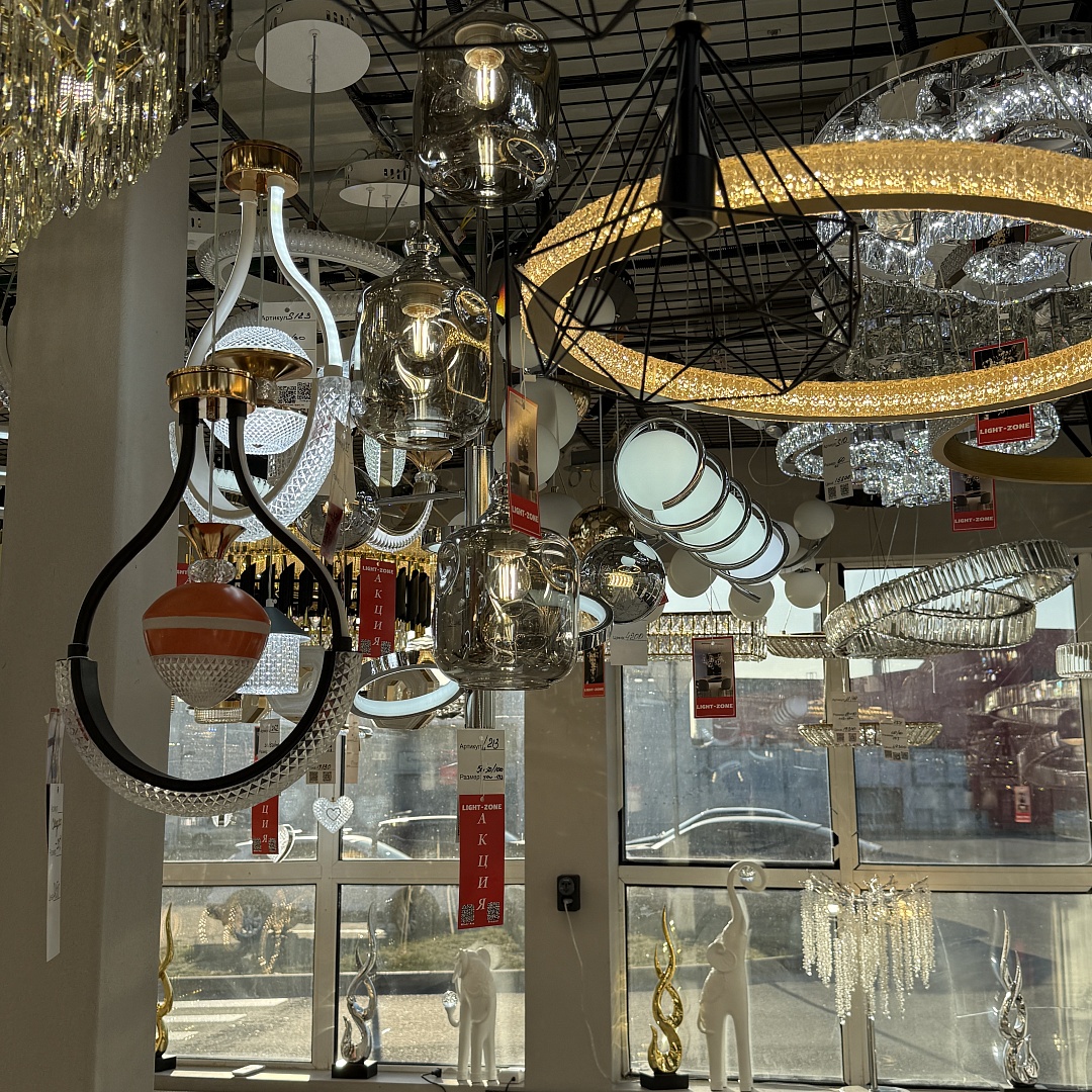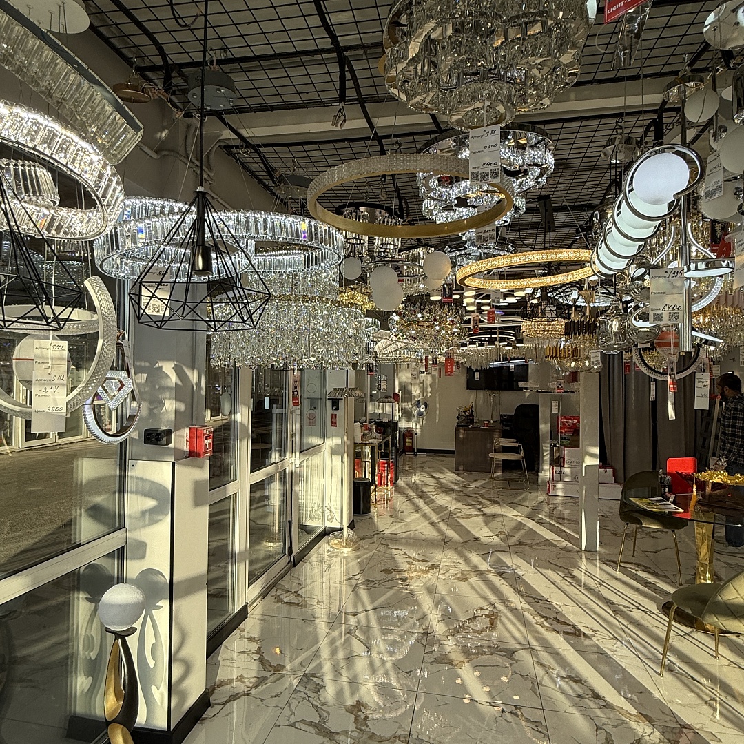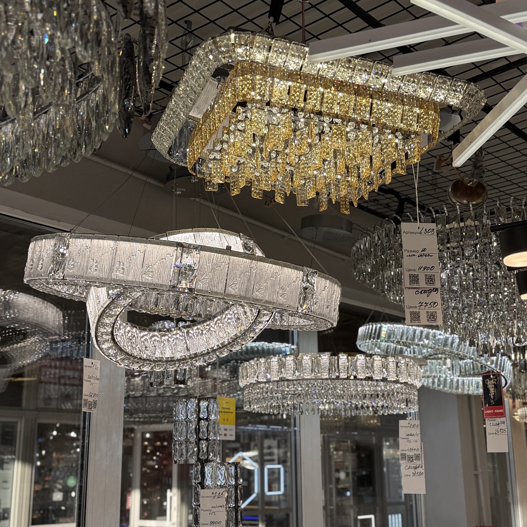 В новом зале сделан упор на потолочные люстры и подвесные модели: крупные варианты со стеклянными и зеркальными элементами, современные световые кольца, каркасные металлические люстры в стиле нео-модерн, линейные светильники для кухонь и гостиных. На стенах — большой выбор подсветки и бра, в том числе компактные решения для коридоров и санузлов. В экспозиции представлены модели разной высоты и диаметра — от подходящих для небольших помещений до эффектных центральных композиций для просторных гостиных и холлов.